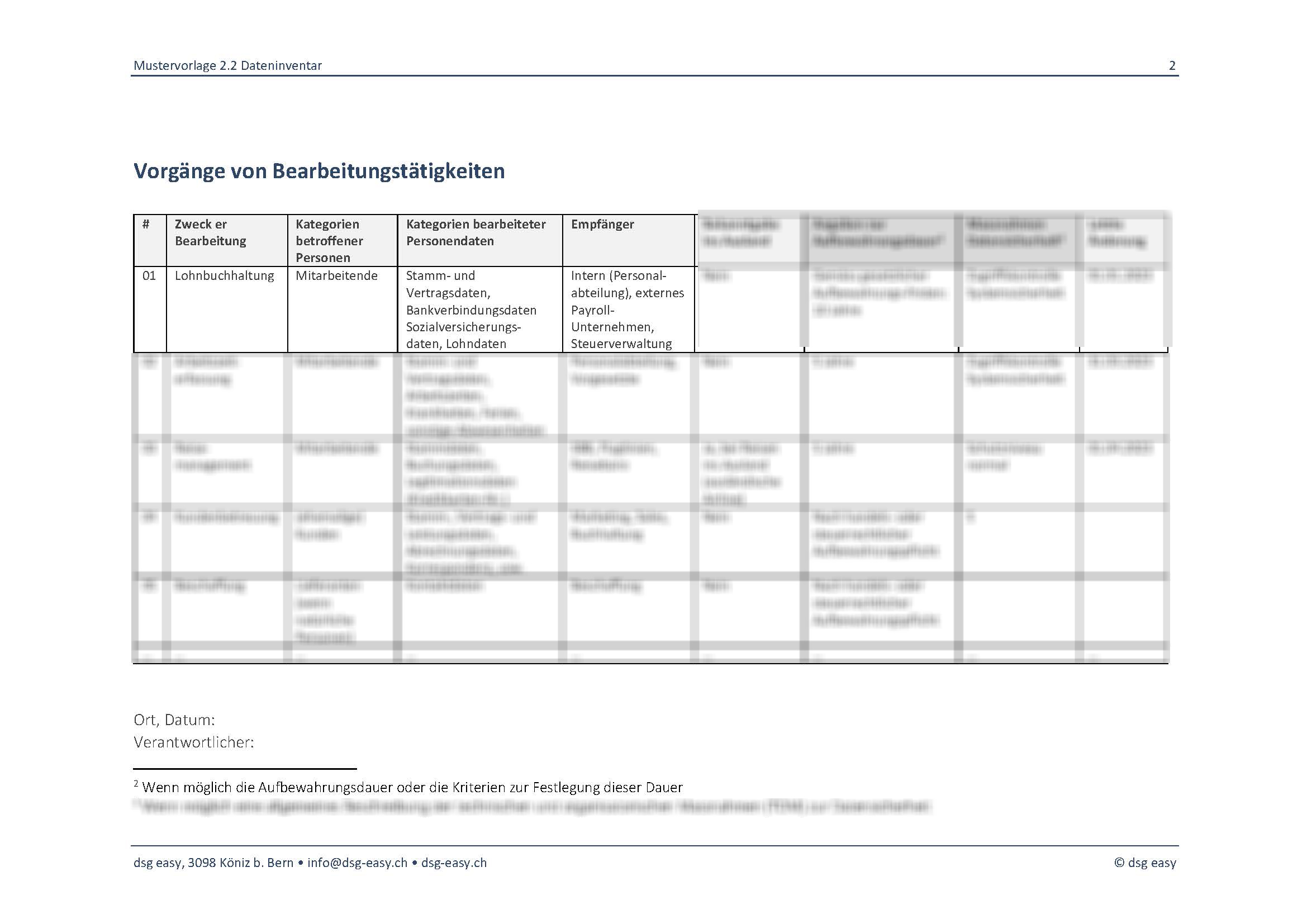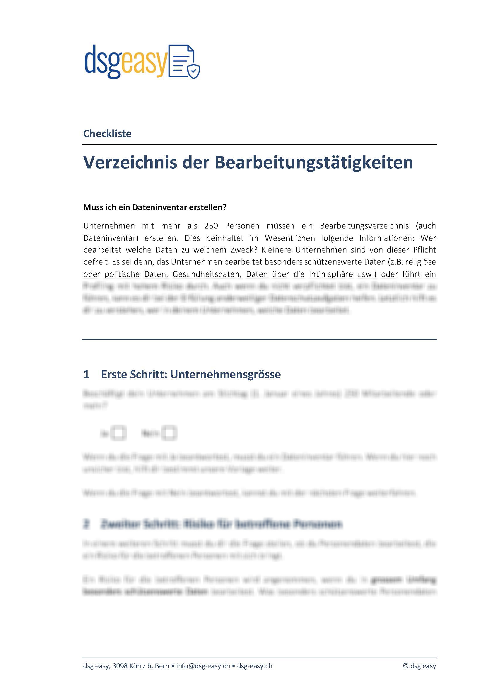 Kleinere Unternehmen sind von dieser Pflicht des Schweizer Datenschutzgesetzes in der Regel befreit Es ist trotzdem ratsam ein solches zu erstellen. Es hilft dir zu verstehen, wer in deinem Unternehmen welche Daten zu welchem Zweck bearbeitet.