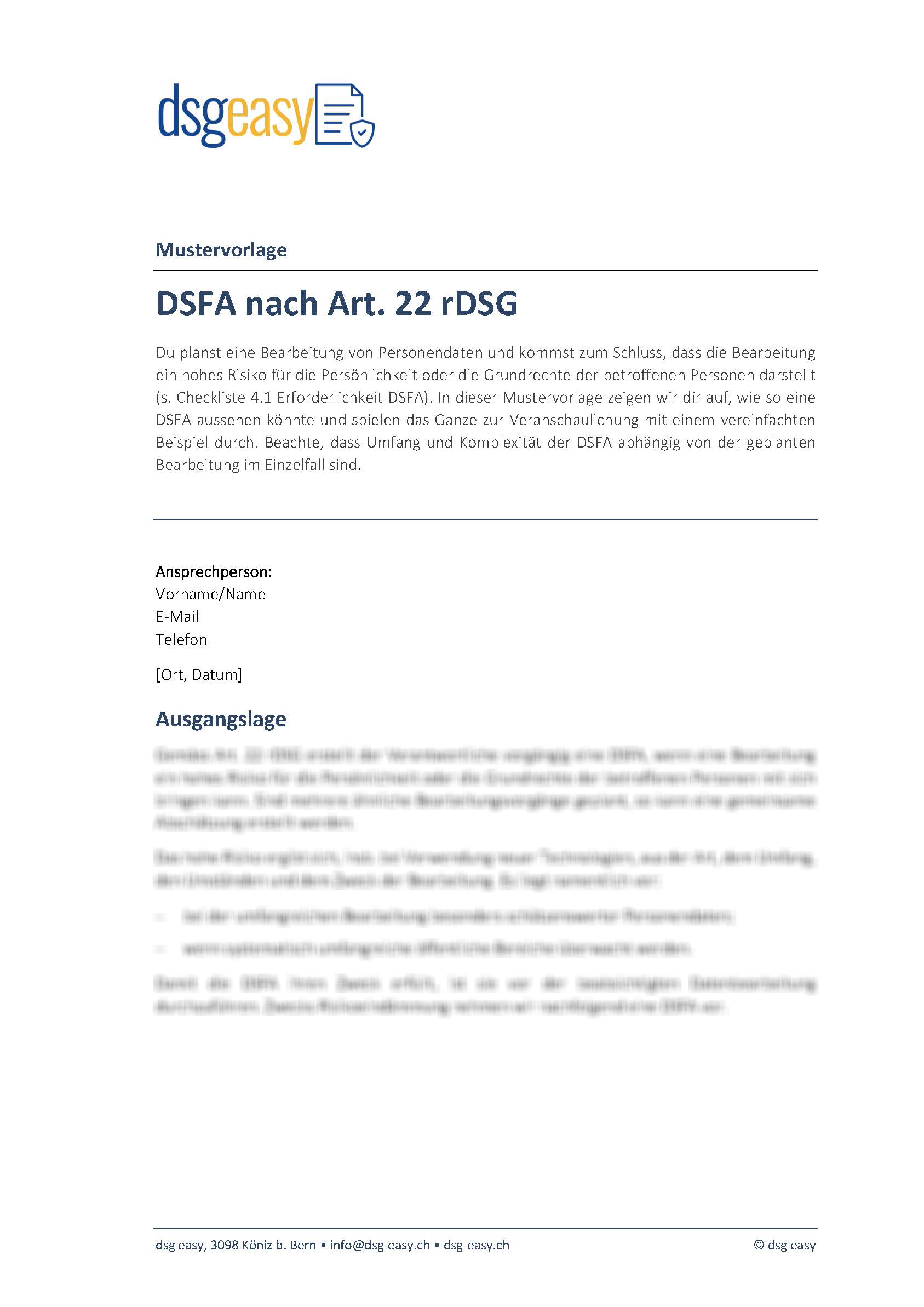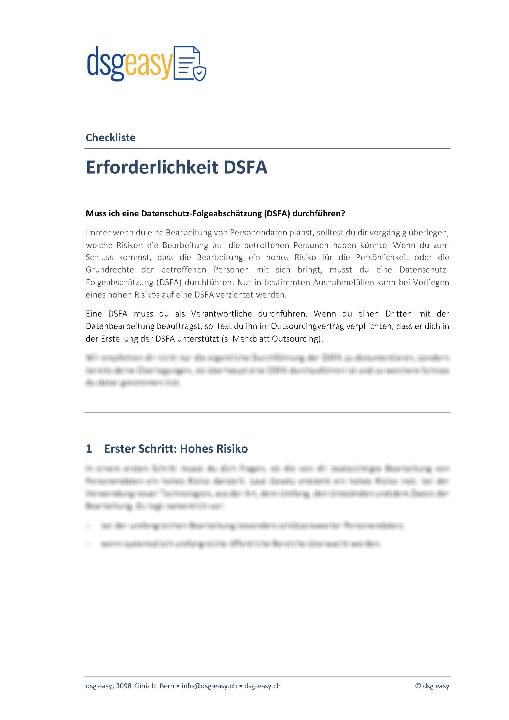 Das Gesetz verpflichtet dich, eine sog. Datenschutz-Folgeabschätzung (DSFA) durchzuführen, wenn die beabsichtigte Bearbeitung von Personendaten ein hohes Risiko für die Betroffenen birgt. Das kann der Fall sein, wenn du besonders sensible Personendaten wie z.B. Gesundheitsdaten, politische oder religiöse Daten bearbeiten willst.